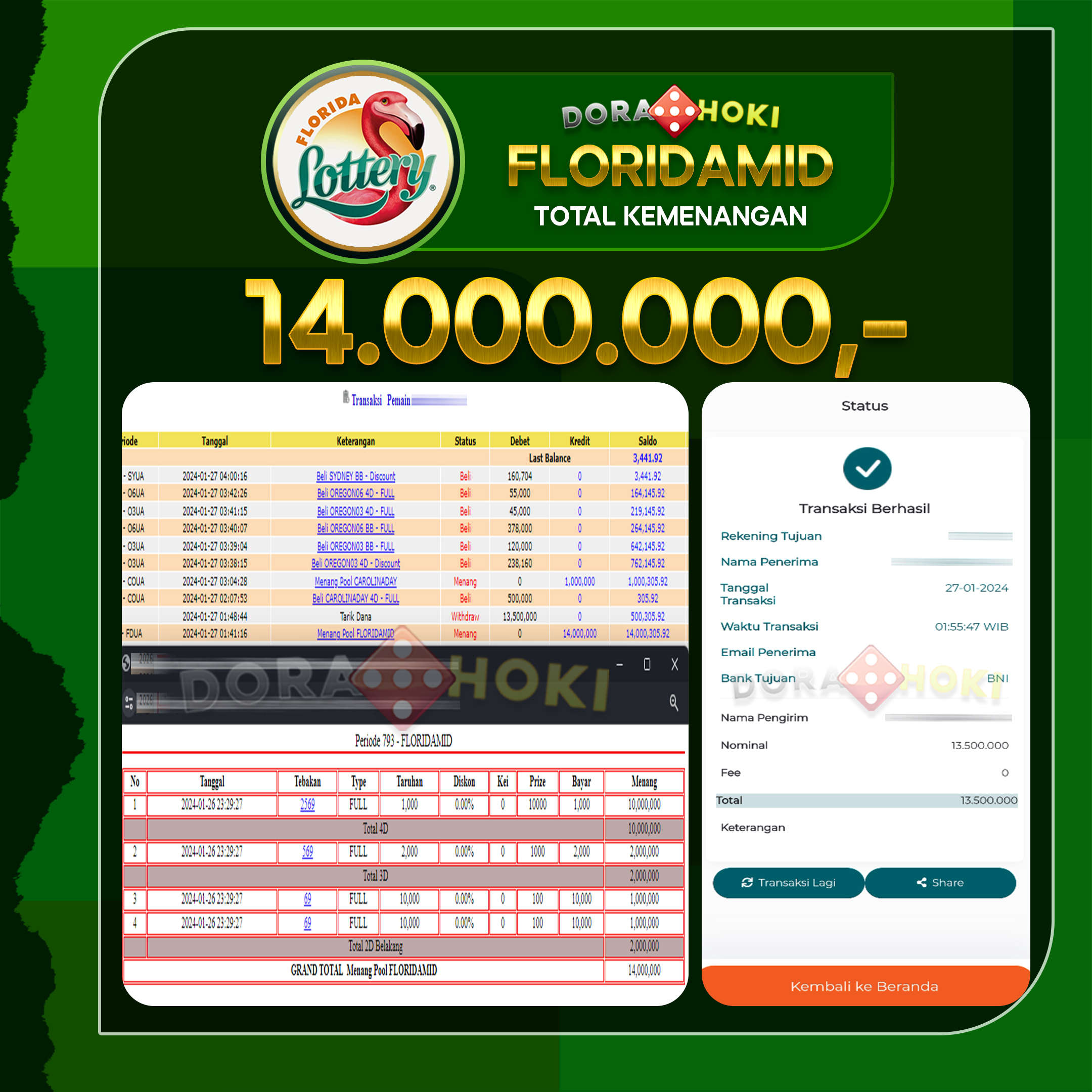 Bukti JP Togel FLORIDAMID – ucapkan selamat kepada user id Rantxxx atas kemenangan di Togel FLORIDAMID dengan total kemenangan Rp.13,500,000,- . Yang pasti nya langsung LUNAS sesuai bukti ya bosku. Dorahoki nih bosku berapapun akan tetap kami bayar lunas ya bosku.