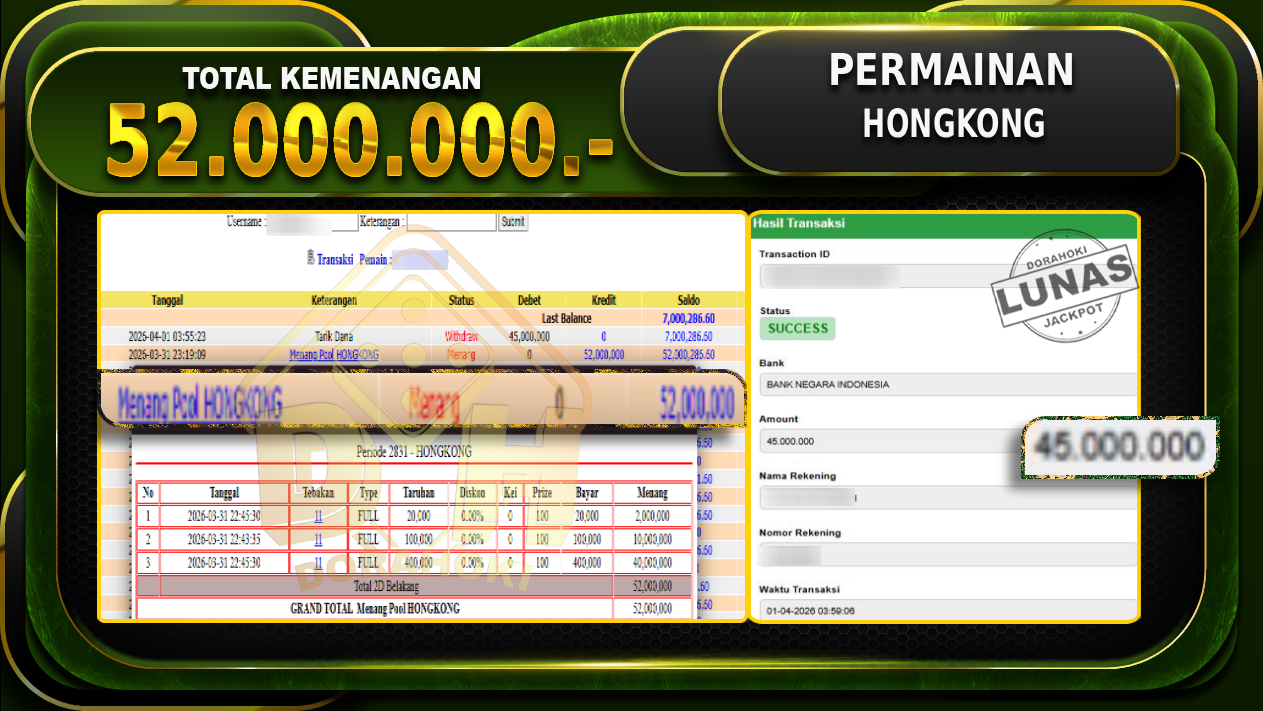 Bukti JP TOGEL HONGKONG – Selamat Kepada User ID: Kupxxx atas kemenangan TOGEL HONGKONG Dengan Nominal Sebesar Rp 52.000.000,- . Yang pasti nya langsung LUNAS Sesuai Bukti.