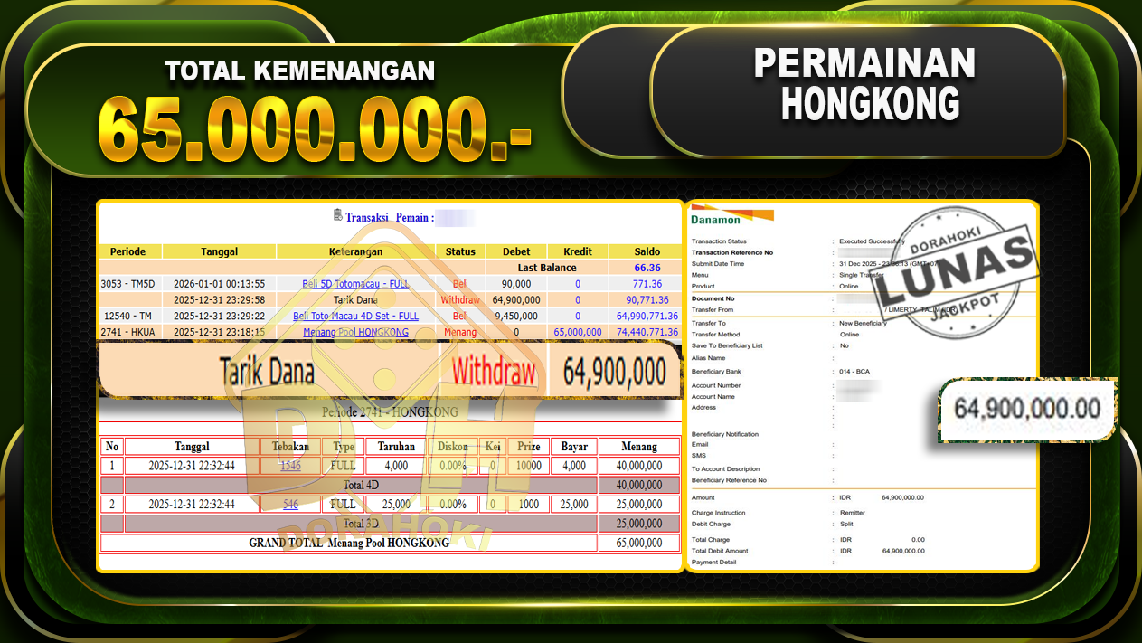 Bukti JP TOGEL HONGKONG – ucapkan selamat kepada user id busxxx atas kemenangan di TOGEL HONGKONG dengan total kemenangan Rp.65.000.000,- . Yang pasti nya langsung LUNAS sesuai bukti ya bosku. Dorahoki nih bosku berapapun akan tetap kami bayar lunas ya bosku.