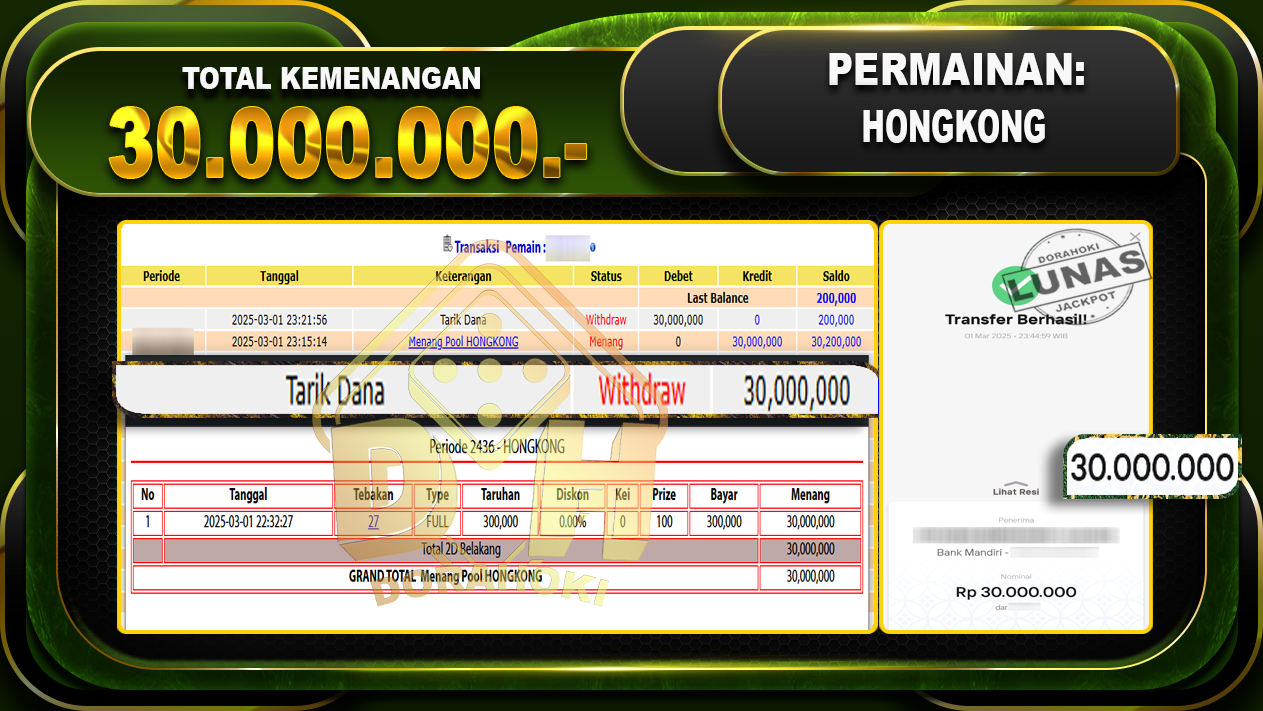 Bukti JP TOGEL HONGKONG – ucapkan selamat kepada user id Polxxx atas kemenangan di TOGEL HONGKONG dengan total kemenangan Rp.30.000.000,- . Yang pasti nya langsung LUNAS sesuai bukti ya bosku. Dorahoki nih bosku berapapun akan tetap kami bayar lunas ya bosku.