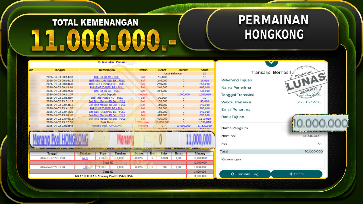 Bukti JP TOGEL HONGKONG – Selamat Kepada User ID: Otixxx atas kemenangan TOGEL HONGKONG Dengan Nominal Sebesar Rp 11.000.000,- . Yang pasti nya langsung LUNAS Sesuai Bukti.