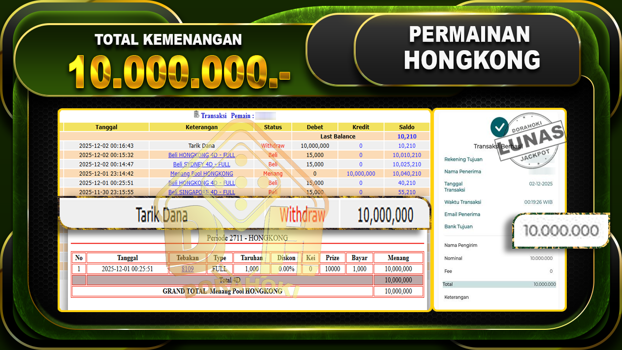 Bukti JP TOGEL HONGKONG – ucapkan selamat kepada user id swixxx atas kemenangan di TOGEL HONGKONG dengan total kemenangan Rp.10,000,000,- . Yang pasti nya langsung LUNAS sesuai bukti ya bosku. Dorahoki nih bosku berapapun akan tetap kami bayar lunas ya bosku.