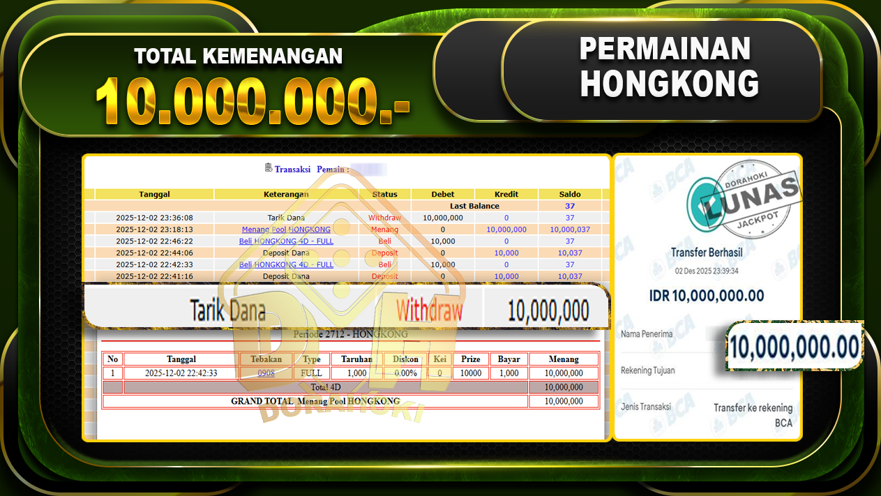 Bukti JP TOGEL HONGKONG – ucapkan selamat kepada user id devxxx atas kemenangan di TOGEL HONGKONG dengan total kemenangan Rp.10,000,000,- . Yang pasti nya langsung LUNAS sesuai bukti ya bosku. Dorahoki nih bosku berapapun akan tetap kami bayar lunas ya bosku.