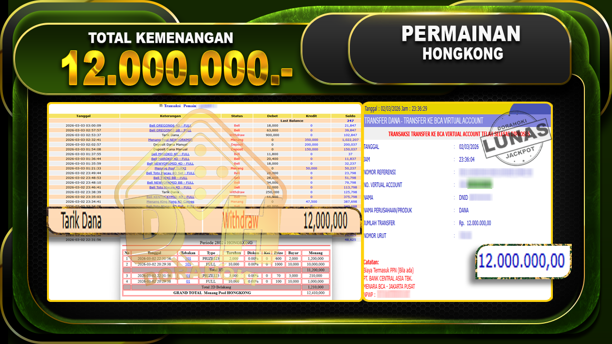 Bukti JP TOGEL HONGKONG – Selamat Kepada User ID: Gaixxx atas kemenangan TOGEL HONGKONG Dengan Nominal Sebesar Rp 12.000.000,- . Yang pasti nya langsung LUNAS Sesuai Bukti.
