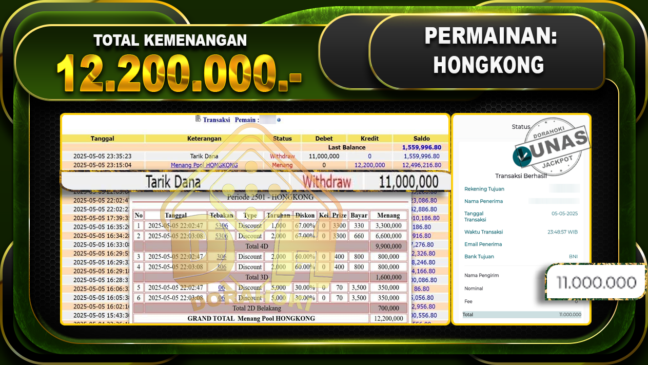 Bukti JP TOGEL HONGKONG – ucapkan selamat kepada user id Kowxxx atas kemenangan di TOGEL HONGKONG dengan total kemenangan Rp 12.200.000,- . Yang pasti nya langsung LUNAS sesuai bukti ya bosku. Dorahoki nih bosku berapapun akan tetap kami bayar lunas ya bosku.