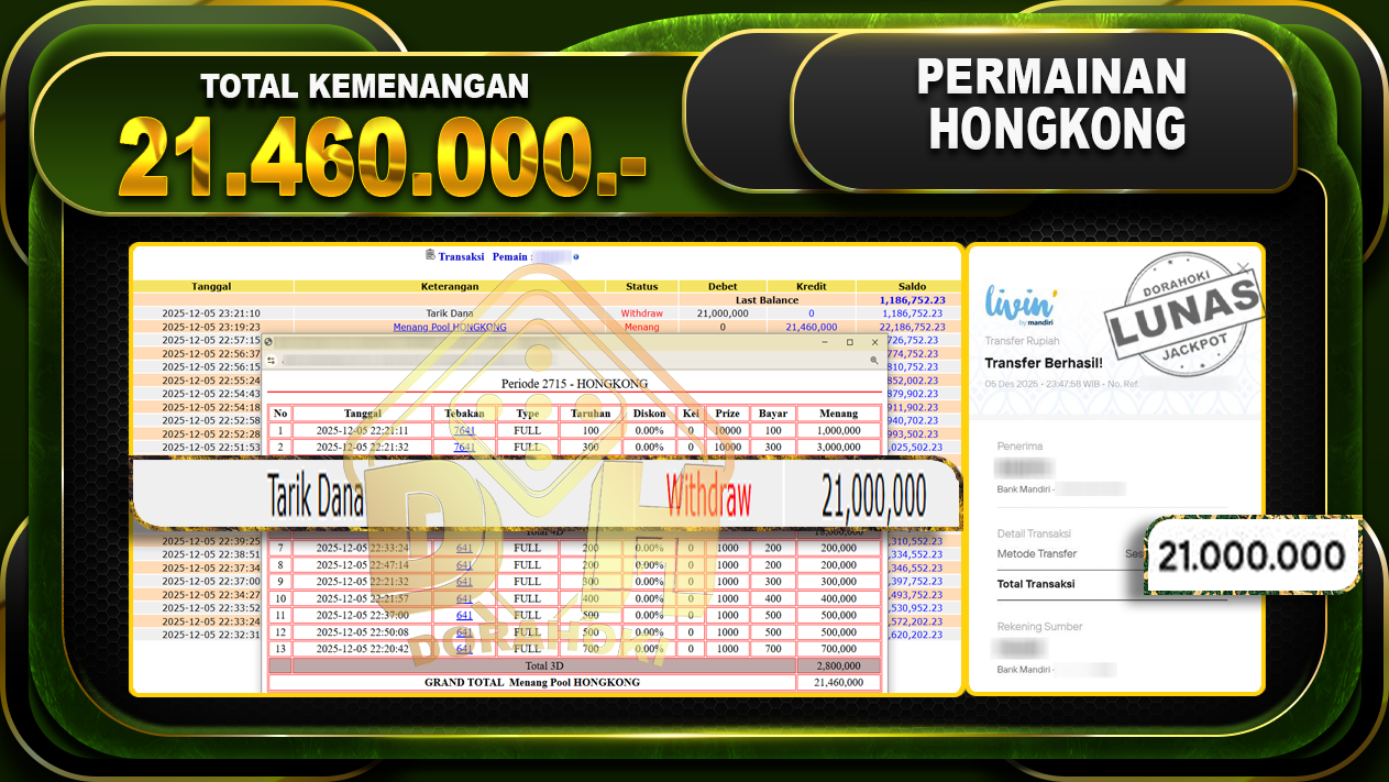 Bukti JP TOGEL HONGKONG – ucapkan selamat kepada user id lasxxxx atas kemenangan di TOGEL HONGKONG dengan total kemenangan Rp.21,460,000,- . Yang pasti nya langsung LUNAS sesuai bukti ya bosku. Dorahoki nih bosku berapapun akan tetap kami bayar lunas ya bosku.