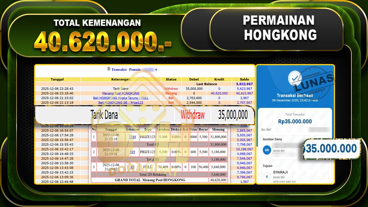 Bukti JP TOGEL HONGKONG – ucapkan selamat kepada user id damxx atas kemenangan di TOGEL HONGKONG dengan total kemenangan Rp.40,620,000,- . Yang pasti nya langsung LUNAS sesuai bukti ya bosku. Dorahoki nih bosku berapapun akan tetap kami bayar lunas ya bosku.