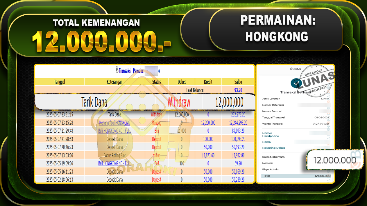 Bukti JP TOGEL HONGKONG – ucapkan selamat kepada user id Sunxxx atas kemenangan di TOGEL HONGKONG dengan total kemenangan Rp 12.000.000,- . Yang pasti nya langsung LUNAS sesuai bukti ya bosku. Dorahoki nih bosku berapapun akan tetap kami bayar lunas ya bosku.