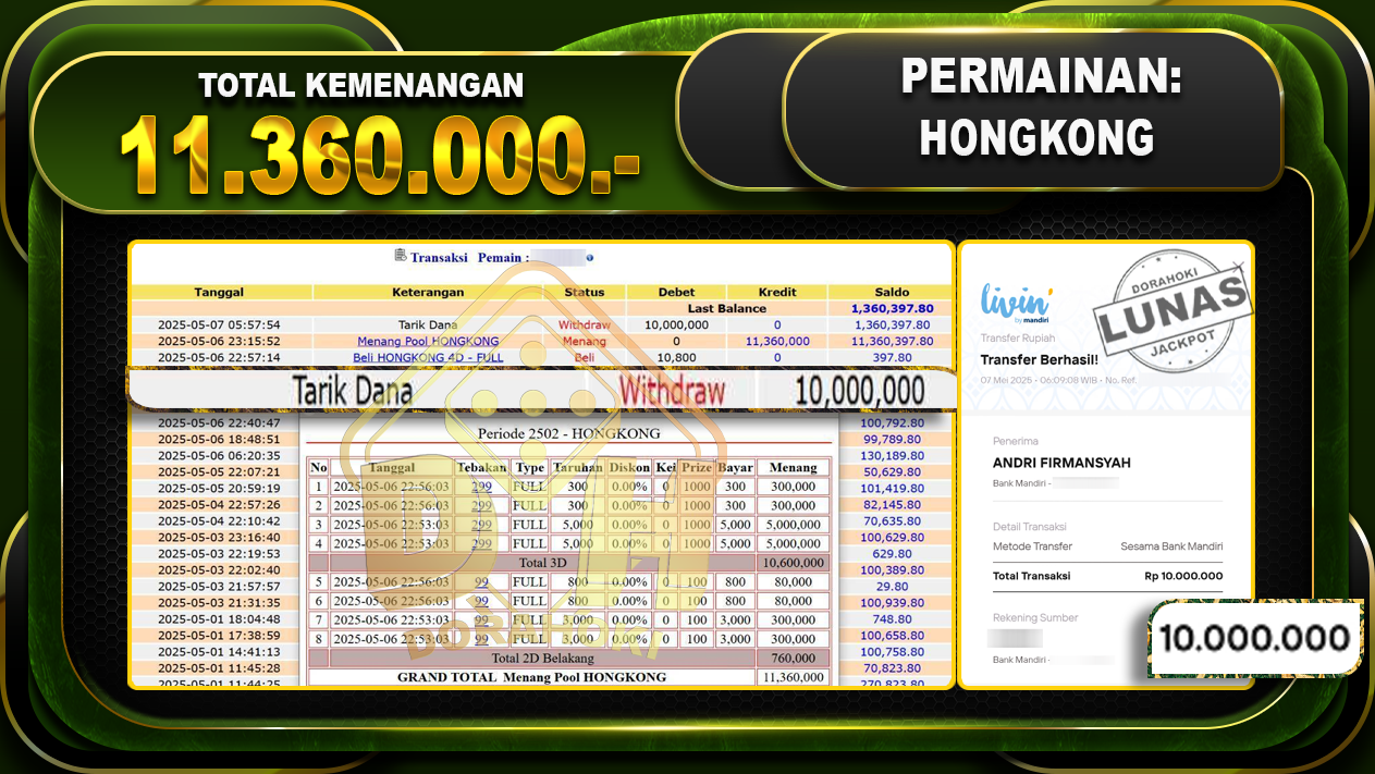 Bukti JP TOGEL HONGKONG – ucapkan selamat kepada user id Bayxxx atas kemenangan di TOGEL HONGKONG dengan total kemenangan Rp 11.360.000,- . Yang pasti nya langsung LUNAS sesuai bukti ya bosku. Dorahoki nih bosku berapapun akan tetap kami bayar lunas ya bosku.