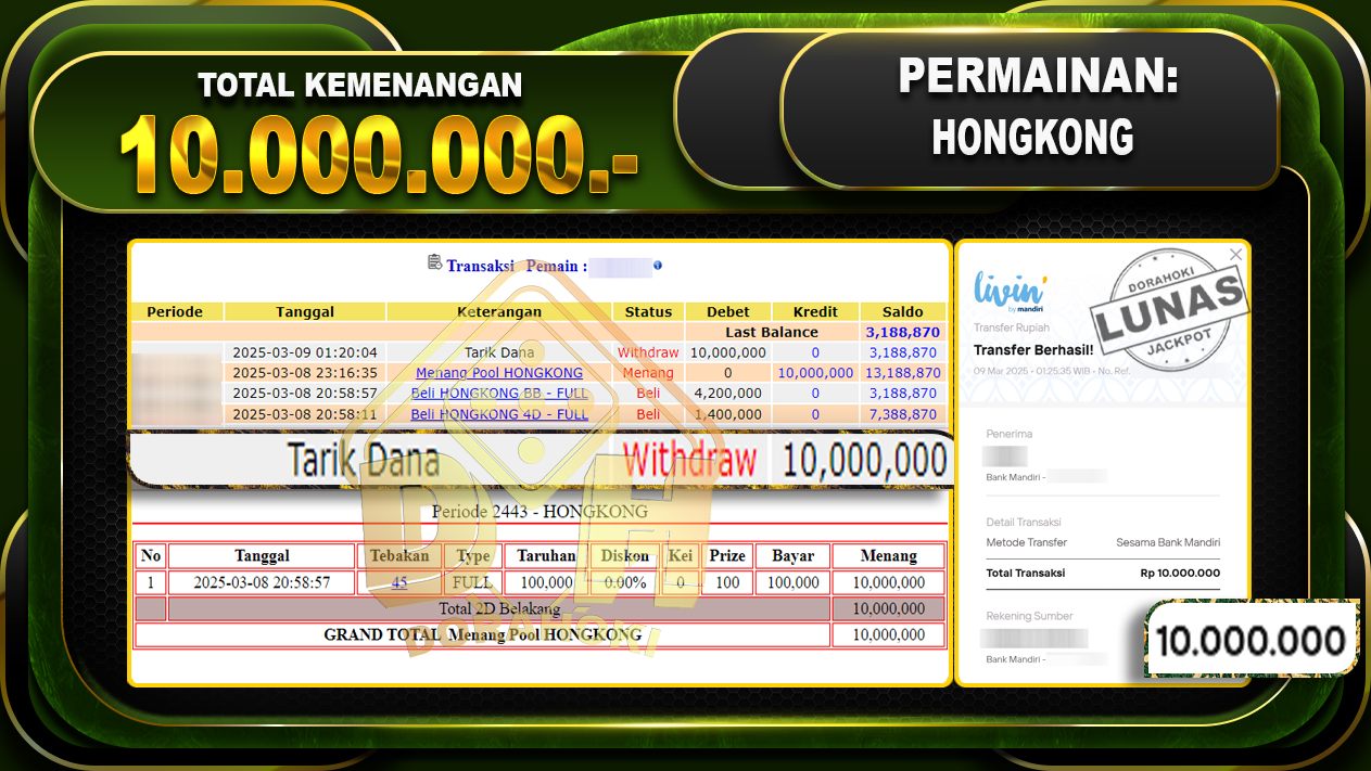 Bukti JP TOGEL HONGKONG – ucapkan selamat kepada user id Gulxxx atas kemenangan di TOGEL HONGKONG dengan total kemenangan Rp.10.000.000,- . Yang pasti nya langsung LUNAS sesuai bukti ya bosku. Dorahoki nih bosku berapapun akan tetap kami bayar lunas ya bosku.