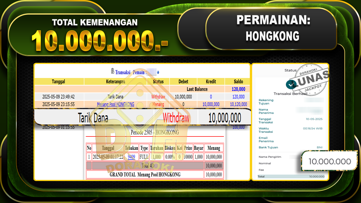 Bukti JP TOGEL HONGKONG – ucapkan selamat kepada user id Merxxx atas kemenangan di TOGEL HONGKONG dengan total kemenangan Rp 10.000.000,- . Yang pasti nya langsung LUNAS sesuai bukti ya bosku. Dorahoki nih bosku berapapun akan tetap kami bayar lunas ya bosku.