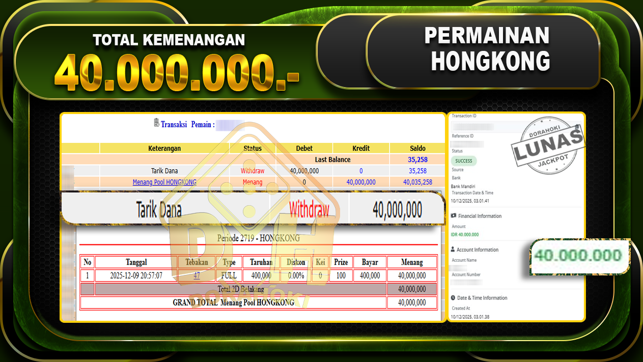 Bukti JP TOGEL HONGKONG – ucapkan selamat kepada user id gulxxxxx atas kemenangan di TOGEL HONGKONG dengan total kemenangan Rp.40,000,000,- . Yang pasti nya langsung LUNAS sesuai bukti ya bosku. Dorahoki nih bosku berapapun akan tetap kami bayar lunas ya bosku.