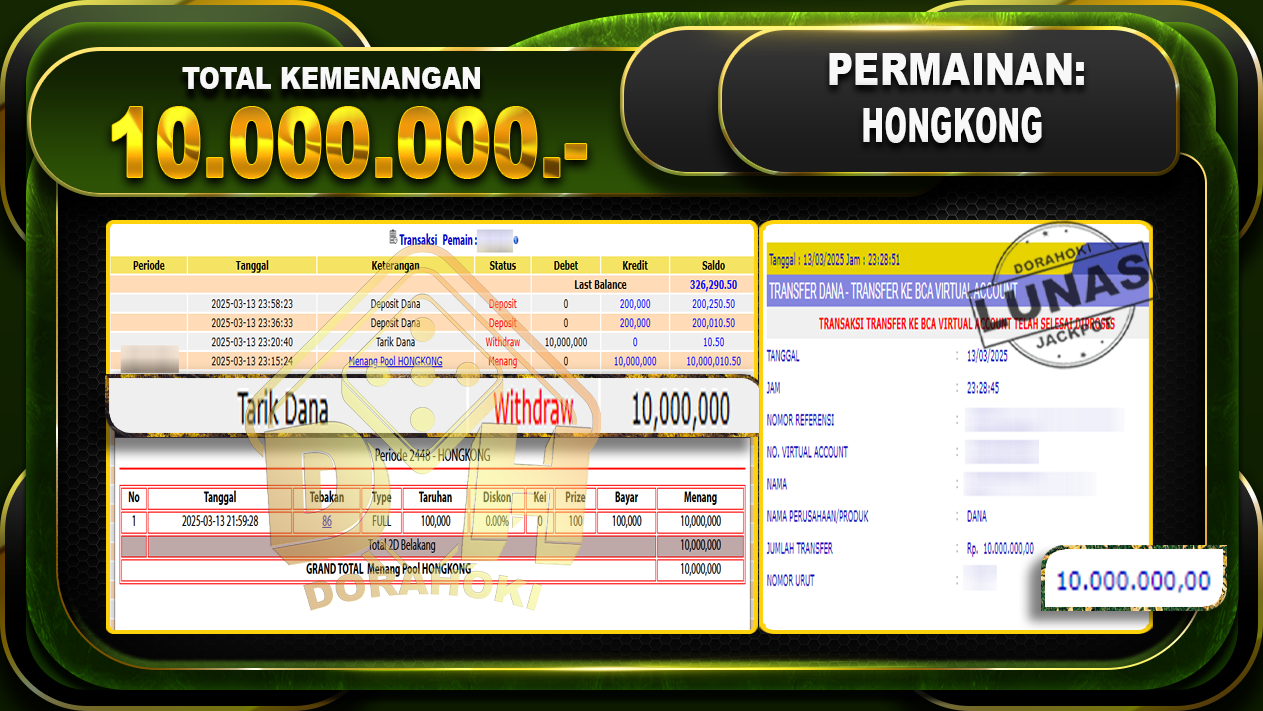 Bukti JP TOGEL HONGKONG – ucapkan selamat kepada user id Gusxxx atas kemenangan di TOGEL HONGKONG dengan total kemenangan Rp.10.000.000,- . Yang pasti nya langsung LUNAS sesuai bukti ya bosku. Dorahoki nih bosku berapapun akan tetap kami bayar lunas ya bosku.