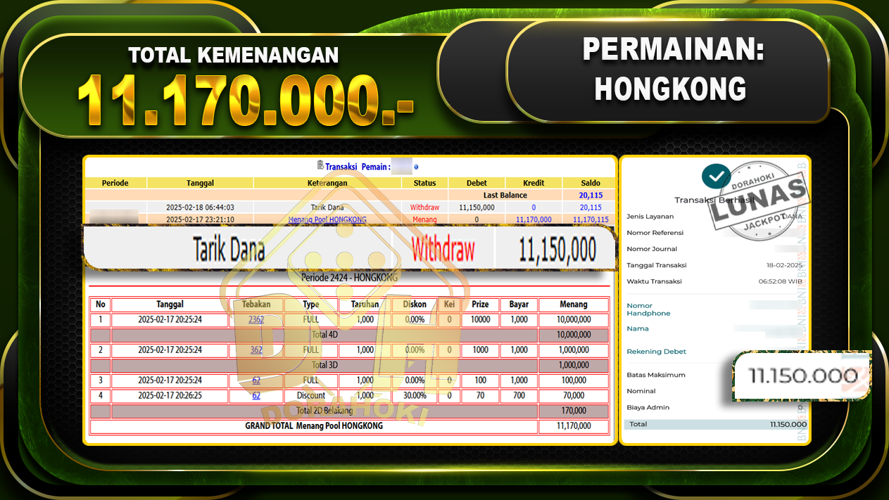 Bukti JP TOGEL HONGKONG – ucapkan selamat kepada user id nopxxx atas kemenangan di TOGEL HONGKONG dengan total kemenangan Rp.11.170.000,- . Yang pasti nya langsung LUNAS sesuai bukti ya bosku. Dorahoki nih bosku berapapun akan tetap kami bayar lunas ya bosku.