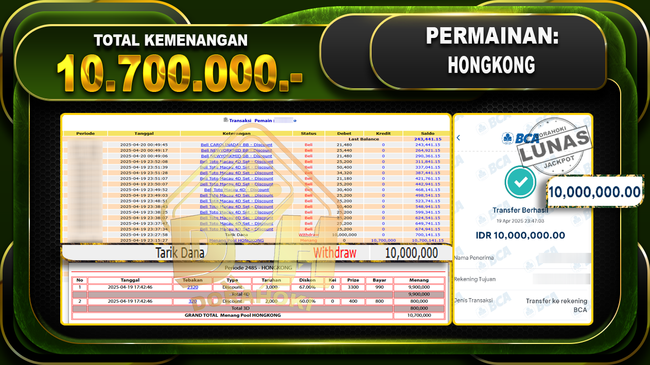 Bukti JP TOGEL HONGKONG – ucapkan selamat kepada user id Tunxxx atas kemenangan di TOGEL HONGKONG dengan total kemenangan Rp10.700.000,- . Yang pasti nya langsung LUNAS sesuai bukti ya bosku. Dorahoki nih bosku berapapun akan tetap kami bayar lunas ya bosku.