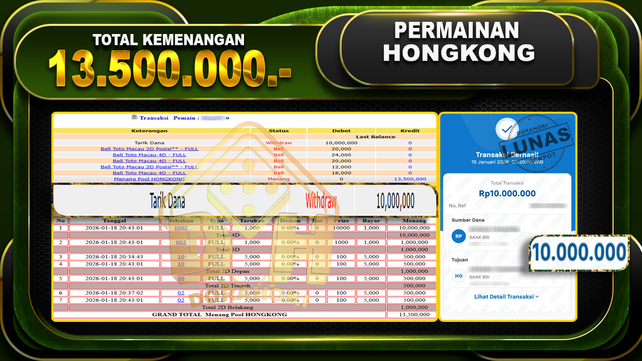 Bukti JP TOGEL HONGKONG – ucapkan selamat kepada user id dirxxx atas kemenangan di TOGEL HONGKONG dengan total kemenangan Rp.13.500.000,- . Yang pasti nya langsung LUNAS sesuai bukti ya bosku. Dorahoki nih bosku berapapun akan tetap kami bayar lunas ya bosku.