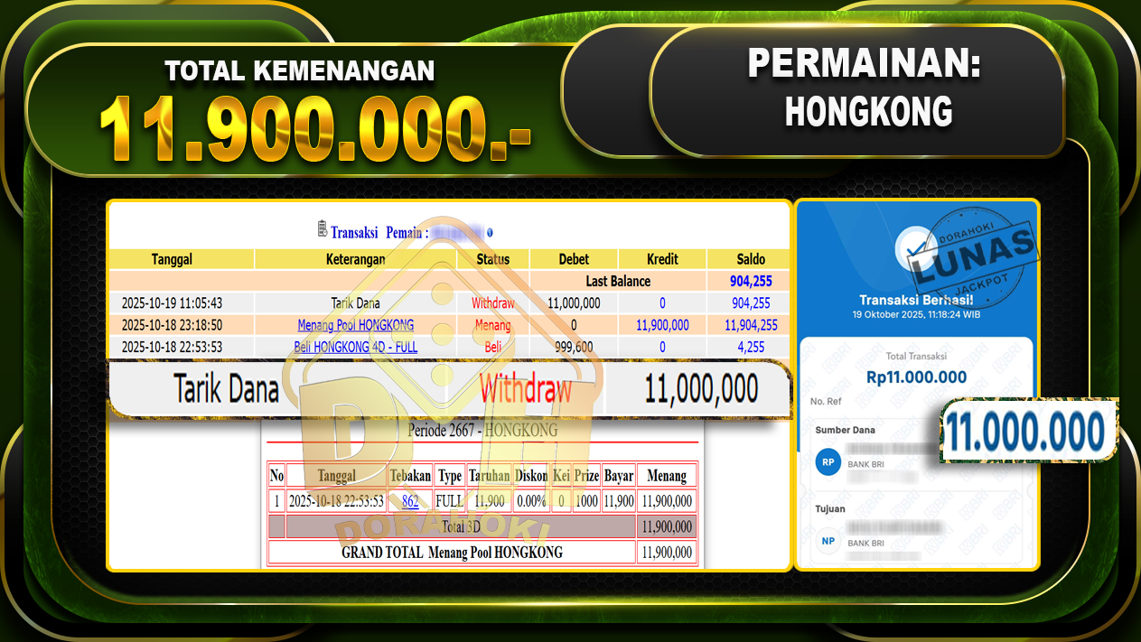 Bukti JP TOGEL HONGKONG – ucapkan selamat kepada user id dorxxxxx atas kemenangan di TOGEL HONGKONG dengan total kemenangan Rp.11,900,000,- . Yang pasti nya langsung LUNAS sesuai bukti ya bosku. Dorahoki nih bosku berapapun akan tetap kami bayar lunas ya bosku.