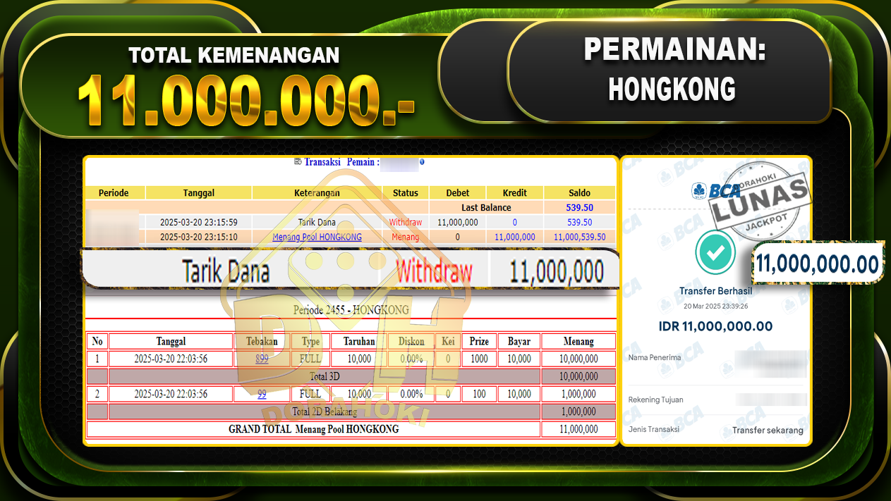 Bukti JP TOGEL HONGKONG – ucapkan selamat kepada user id Goixxx atas kemenangan di TOGEL HONGKONG dengan total kemenangan Rp.11.000.000,- . Yang pasti nya langsung LUNAS sesuai bukti ya bosku. Dorahoki nih bosku berapapun akan tetap kami bayar lunas ya bosku.