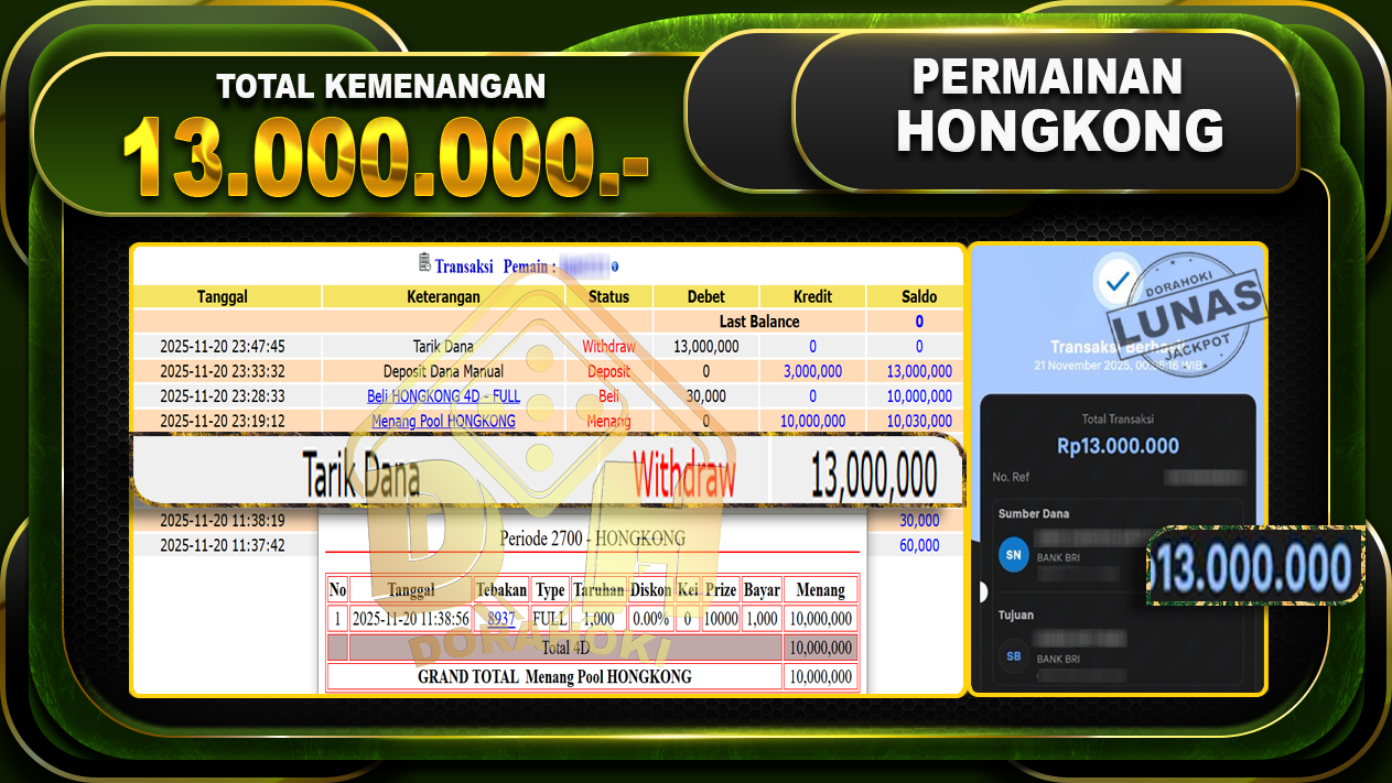 Bukti JP TOGEL HONGKONG – ucapkan selamat kepada user id ligxxxxx atas kemenangan di TOGEL HONGKONG dengan total kemenangan Rp.13,000,000,- . Yang pasti nya langsung LUNAS sesuai bukti ya bosku. Dorahoki nih bosku berapapun akan tetap kami bayar lunas ya bosku.