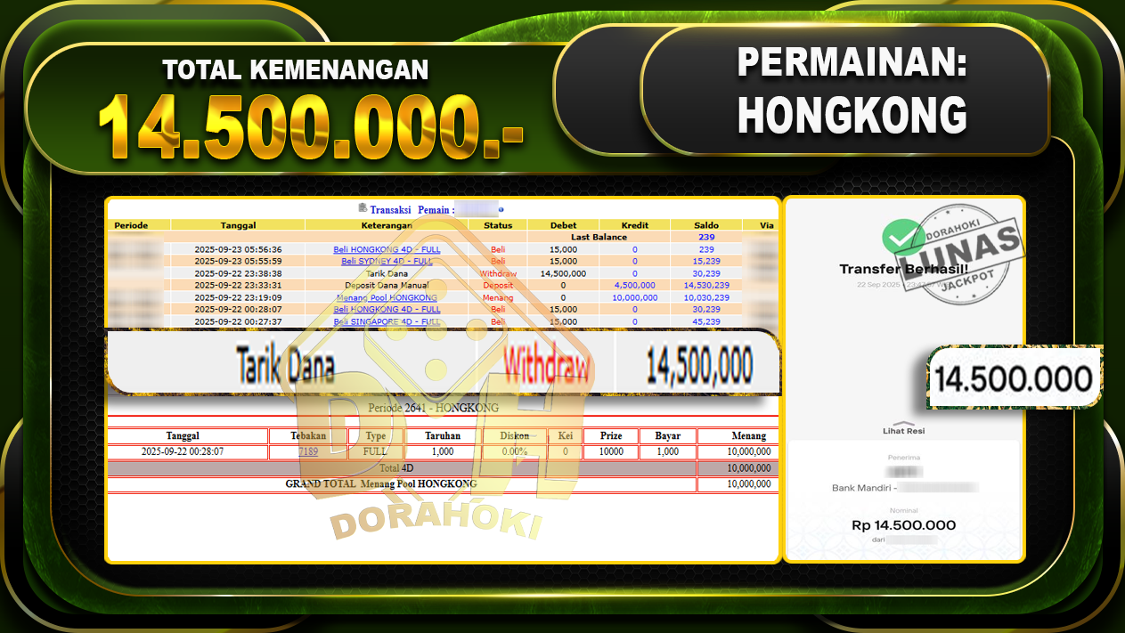 Bukti JP TOGEL HONGKONG – ucapkan selamat kepada user id hujxxxxx atas kemenangan di TOGEL HONGKONG dengan total kemenangan Rp.14,500,000 ,- . Yang pasti nya langsung LUNAS sesuai bukti ya bosku. Dorahoki nih bosku berapapun akan tetap kami bayar lunas ya bosku.