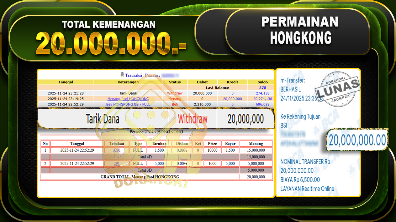 Bukti JP TOGEL HONGKONG – ucapkan selamat kepada user id sinxxxx atas kemenangan di TOGEL HONGKONG dengan total kemenangan Rp.20,000,000,- . Yang pasti nya langsung LUNAS sesuai bukti ya bosku. Dorahoki nih bosku berapapun akan tetap kami bayar lunas ya bosku.