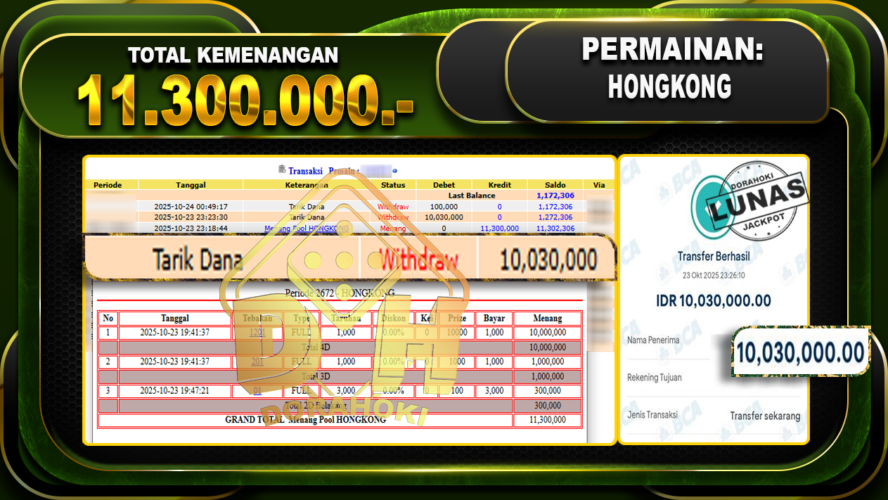 Bukti JP TOGEL HONGKONG – ucapkan selamat kepada user id nngxxxxx atas kemenangan di TOGEL HONGKONG dengan total kemenangan Rp.11,300,000,- . Yang pasti nya langsung LUNAS sesuai bukti ya bosku. Dorahoki nih bosku berapapun akan tetap kami bayar lunas ya bosku.