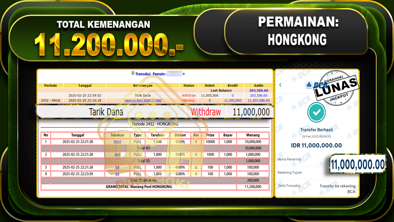 Bukti JP TOGEL HONGKONG – ucapkan selamat kepada user id ADIxxx atas kemenangan di TOGEL HONGKONG dengan total kemenangan Rp.11.200.000,- . Yang pasti nya langsung LUNAS sesuai bukti ya bosku. Dorahoki nih bosku berapapun akan tetap kami bayar lunas ya bosku.