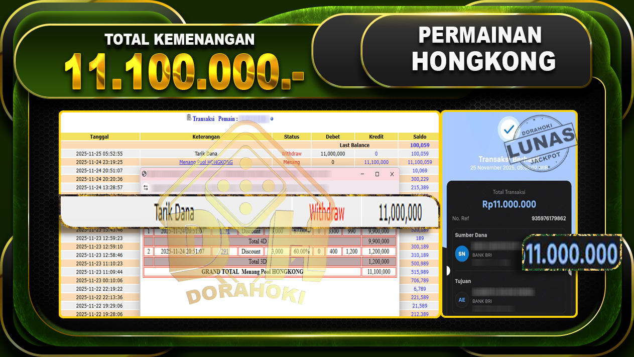 Bukti JP TOGEL HONGKONG – ucapkan selamat kepada user id banxxxx atas kemenangan di TOGEL HONGKONG dengan total kemenangan Rp.11,100,000,- . Yang pasti nya langsung LUNAS sesuai bukti ya bosku. Dorahoki nih bosku berapapun akan tetap kami bayar lunas ya bosku.