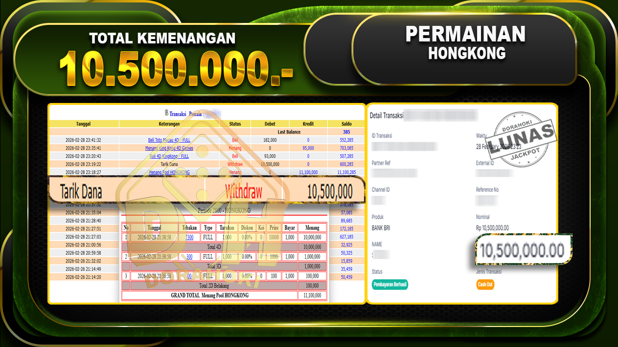Bukti JP TOGEL HONGKONG – Selamat Kepada User ID: Isqxxx atas kemenangan TOGEL HONGKONG Dengan Nominal Sebesar Rp 10.500.000,- . Yang pasti nya langsung LUNAS Sesuai Bukti.