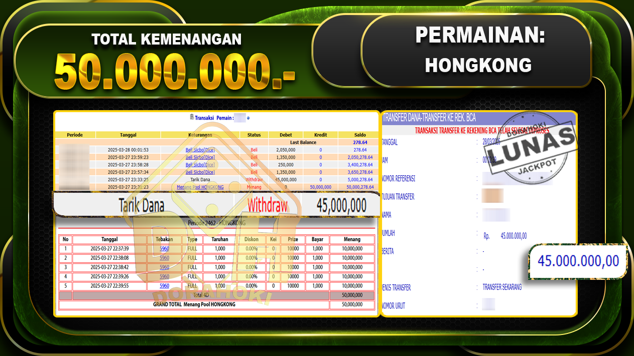 Bukti JP TOGEL HONGKONG – ucapkan selamat kepada user id Gapxxx atas kemenangan di TOGEL HONGKONG dengan total kemenangan Rp.50.000.000,- . Yang pasti nya langsung LUNAS sesuai bukti ya bosku. Dorahoki nih bosku berapapun akan tetap kami bayar lunas ya bosku.