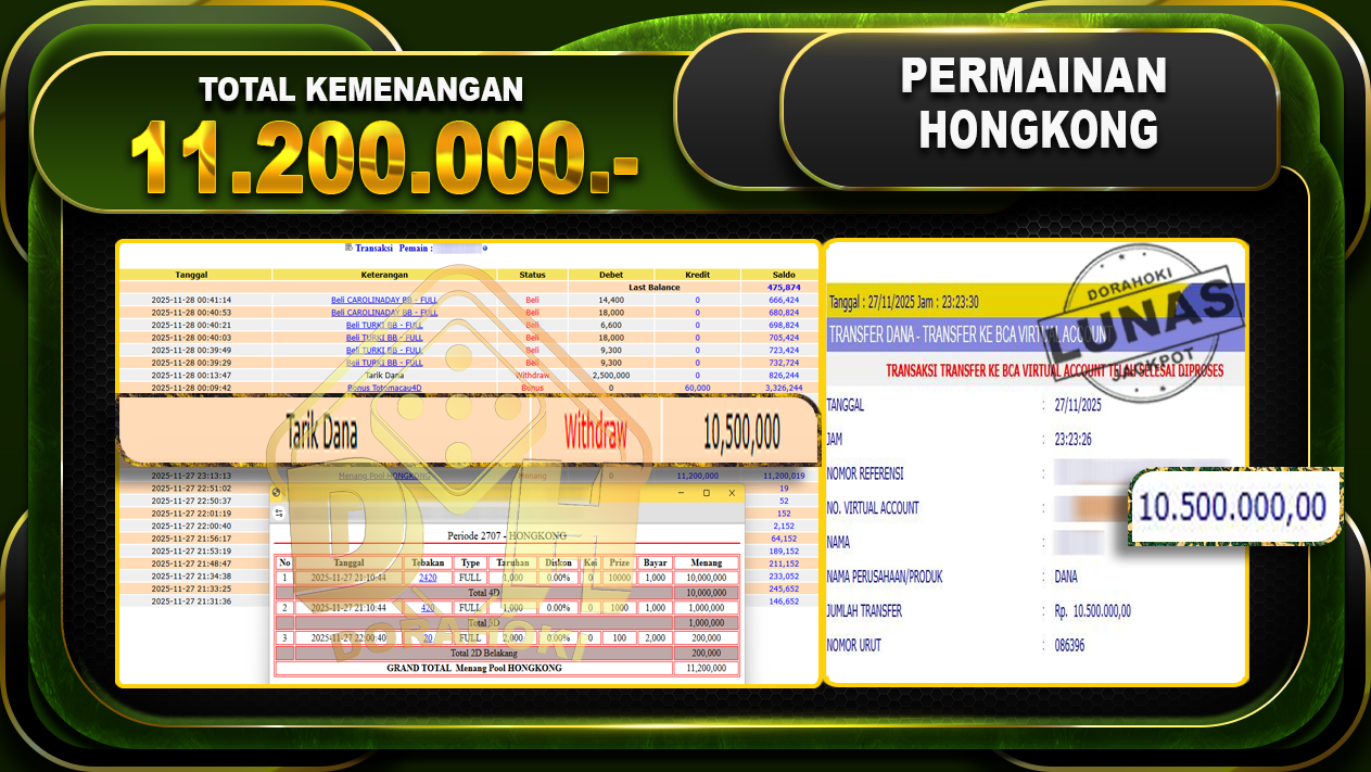 Bukti JP TOGEL HONGKONG – ucapkan selamat kepada user id jamxxxxx atas kemenangan di TOGEL HONGKONG dengan total kemenangan Rp.11,200,000,- . Yang pasti nya langsung LUNAS sesuai bukti ya bosku. Dorahoki nih bosku berapapun akan tetap kami bayar lunas ya bosku.