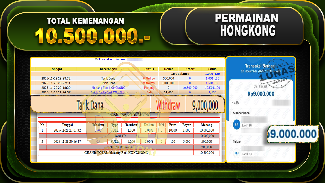 Bukti JP TOGEL HONGKONG – ucapkan selamat kepada user id mrixxxxx atas kemenangan di TOGEL HONGKONG dengan total kemenangan Rp.10,500,000,- . Yang pasti nya langsung LUNAS sesuai bukti ya bosku. Dorahoki nih bosku berapapun akan tetap kami bayar lunas ya bosku.