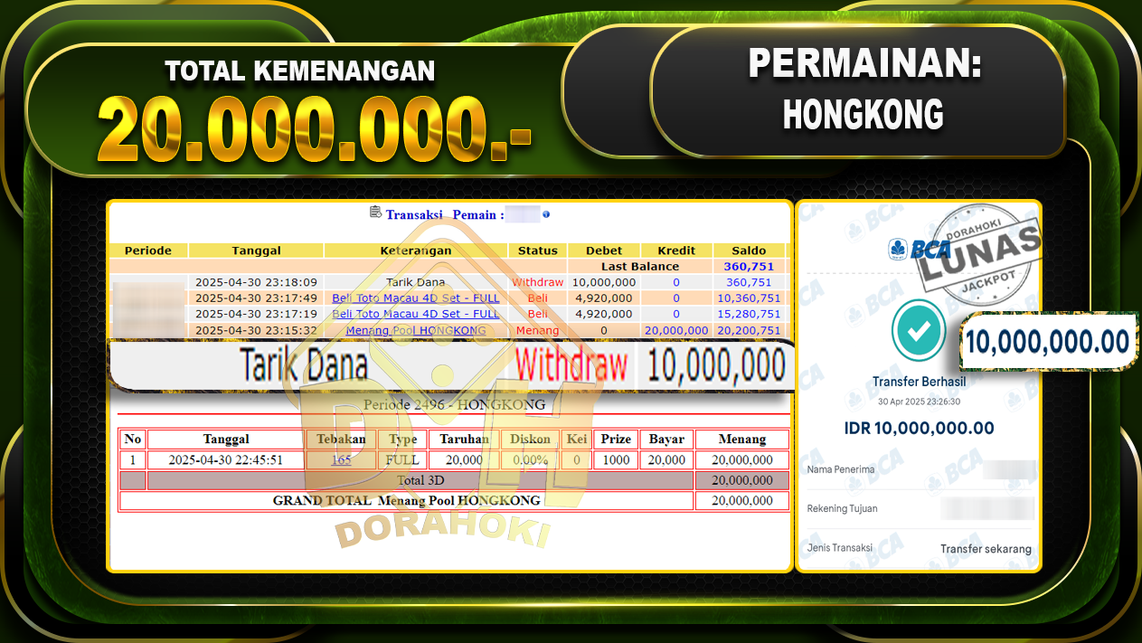 Bukti JP TOGEL HONGKONG – ucapkan selamat kepada user id Busxxx atas kemenangan di TOGEL HONGKONG dengan total kemenangan Rp 20.000.000,- . Yang pasti nya langsung LUNAS sesuai bukti ya bosku. Dorahoki nih bosku berapapun akan tetap kami bayar lunas ya bosku.