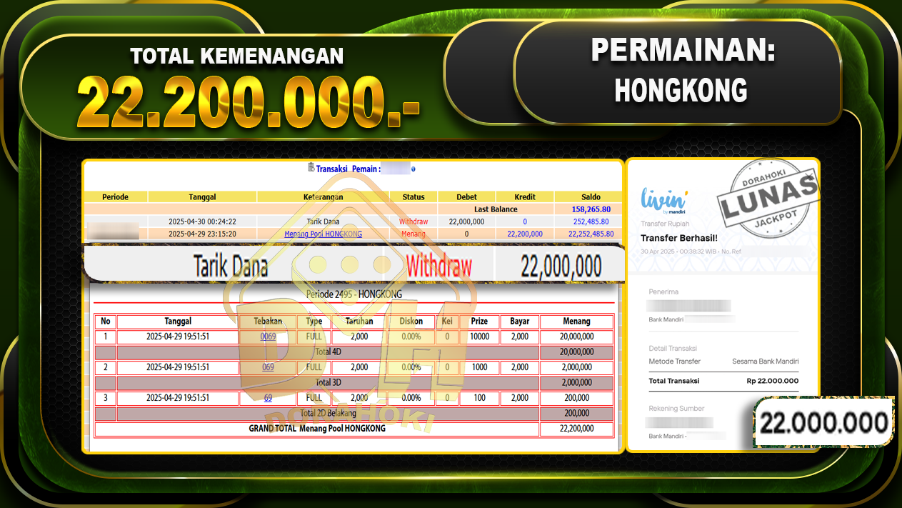 Bukti JP TOGEL HONGKONG – ucapkan selamat kepada user id Lanxxx atas kemenangan di TOGEL HONGKONG dengan total kemenangan Rp 22.200.000,- . Yang pasti nya langsung LUNAS sesuai bukti ya bosku. Dorahoki nih bosku berapapun akan tetap kami bayar lunas ya bosku.