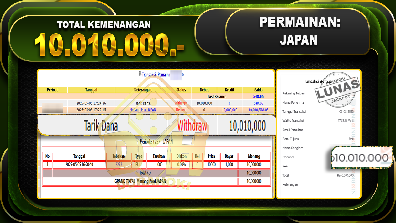 Bukti JP TOGEL JAPAN- ucapkan selamat kepada user id Jawxxx atas kemenangan di TOGEL JAPAN dengan total kemenangan Rp.10.010.000,- . Yang pasti nya langsung LUNAS sesuai bukti ya bosku. Dorahoki nih bosku berapapun akan tetap kami bayar lunas ya bosku.