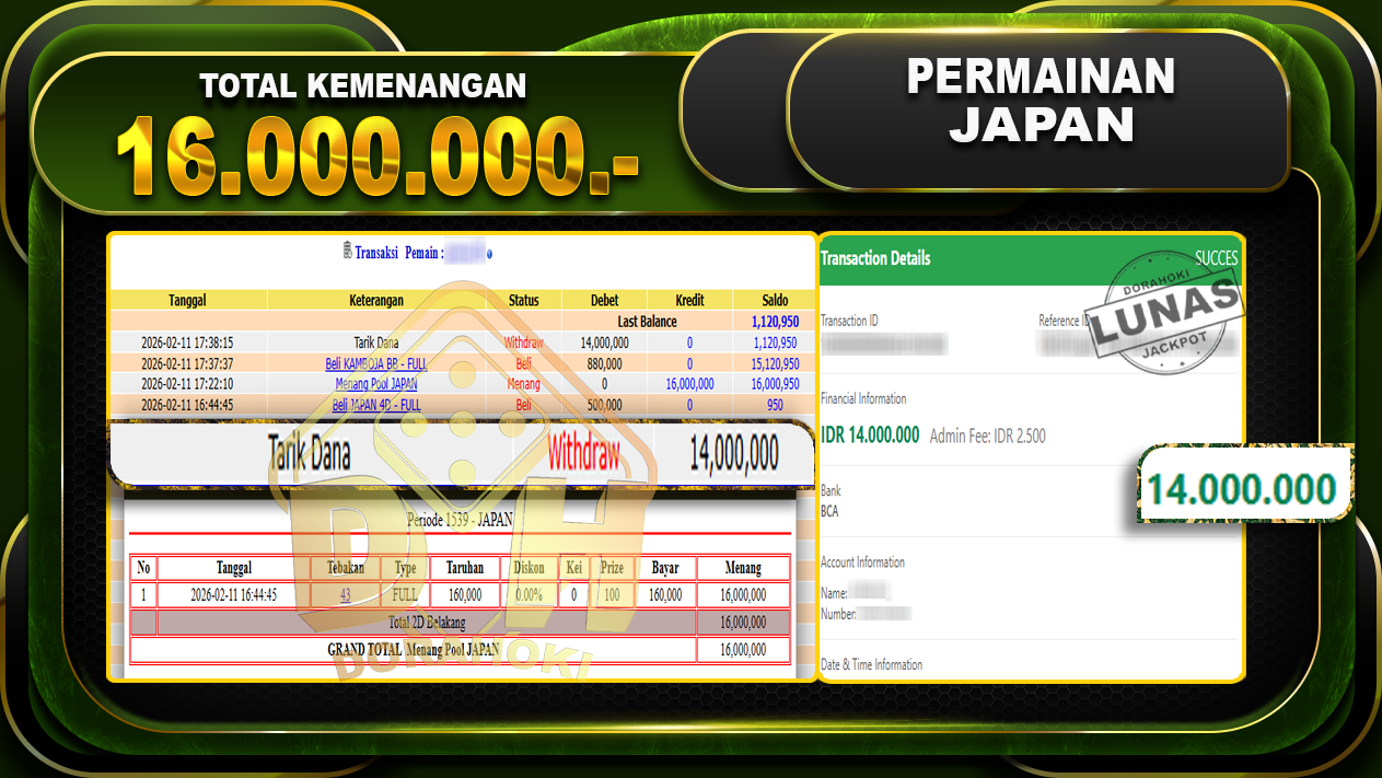 Bukti JP TOGEL JAPAN – Selamat Kepada User ID : ajlxxx atas kemenangan TOGEL JAPAN Dengan Nominal Sebesar Rp.16.000.000,- Yang pasti nya langsung LUNAS Sesuai Bukti.