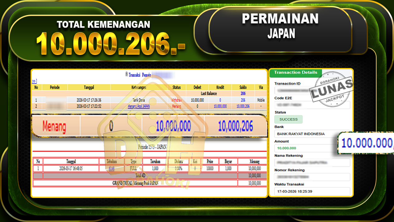 Bukti JP TOGEL JAPAN – Selamat Kepada User ID : Banxxx atas kemenangan TOGEL JAPAN Dengan Nominal Sebesar Rp.10.000.206,- Yang pasti nya langsung LUNAS Sesuai Bukti.