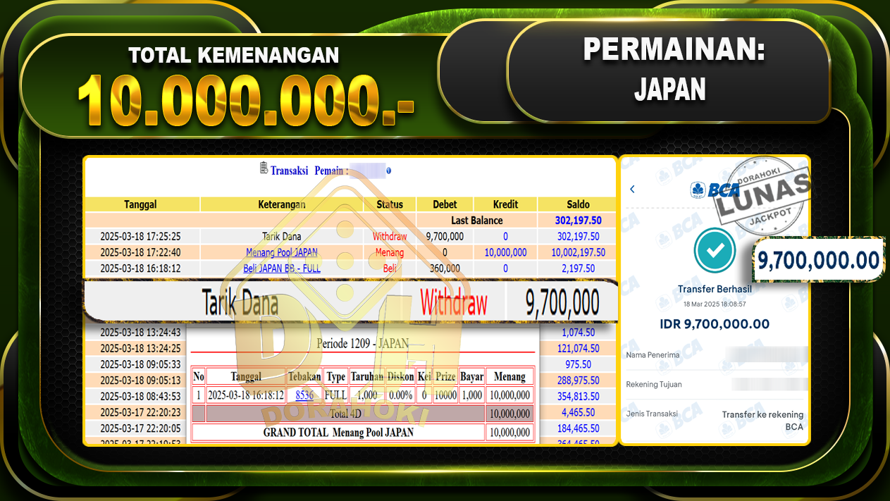 Bukti JP TOGEL JAPAN- ucapkan selamat kepada user id Agoxxx atas kemenangan di TOGEL JAPAN dengan total kemenangan Rp.10.000.000,- . Yang pasti nya langsung LUNAS sesuai bukti ya bosku. Dorahoki nih bosku berapapun akan tetap kami bayar lunas ya bosku.