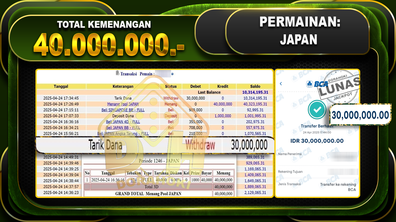 Bukti JP TOGEL JAPAN- ucapkan selamat kepada user id 148xxx atas kemenangan di TOGEL JAPAN dengan total kemenangan Rp.40.000.000,- . Yang pasti nya langsung LUNAS sesuai bukti ya bosku. Dorahoki nih bosku berapapun akan tetap kami bayar lunas ya bosku.