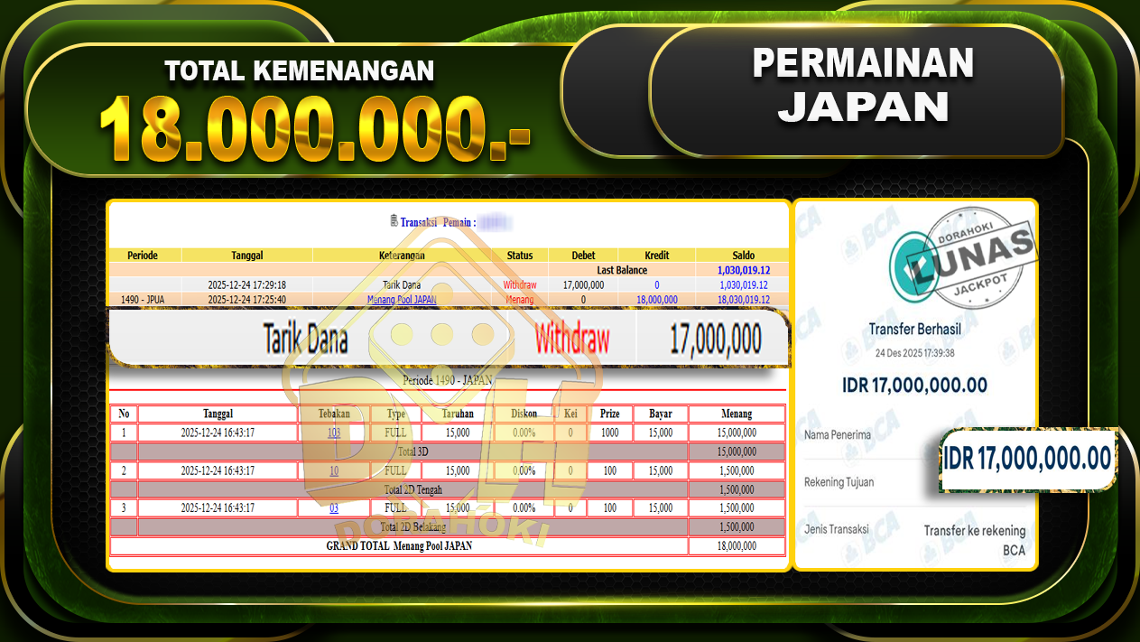 Bukti JP TOGEL JAPAN – ucapkan selamat kepada user id yatxxx atas kemenangan di TOGEL JAPAN dengan total kemenangan Rp.18.000.000,- Yang pasti nya langsung LUNAS sesuai bukti ya bosku. Dorahoki nih bosku berapapun akan tetap kami bayar lunas ya bosku