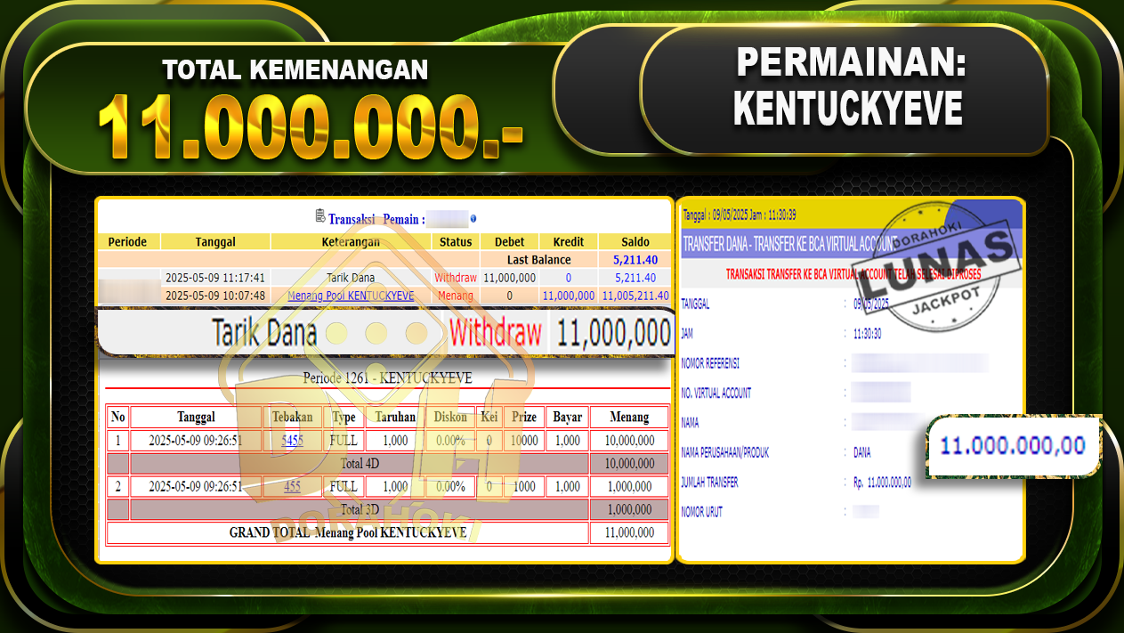Bukti JP TOGEL KENTUCKY EVE – ucapkan selamat kepada user id Asbxxx atas kemenangan di TOGEL KENTUCKY EVE dengan total kemenangan Rp.11.000.000,- . Yang pasti nya langsung LUNAS sesuai bukti ya bosku. Dorahoki nih bosku berapapun akan tetap kami bayar lunas ya bosku.