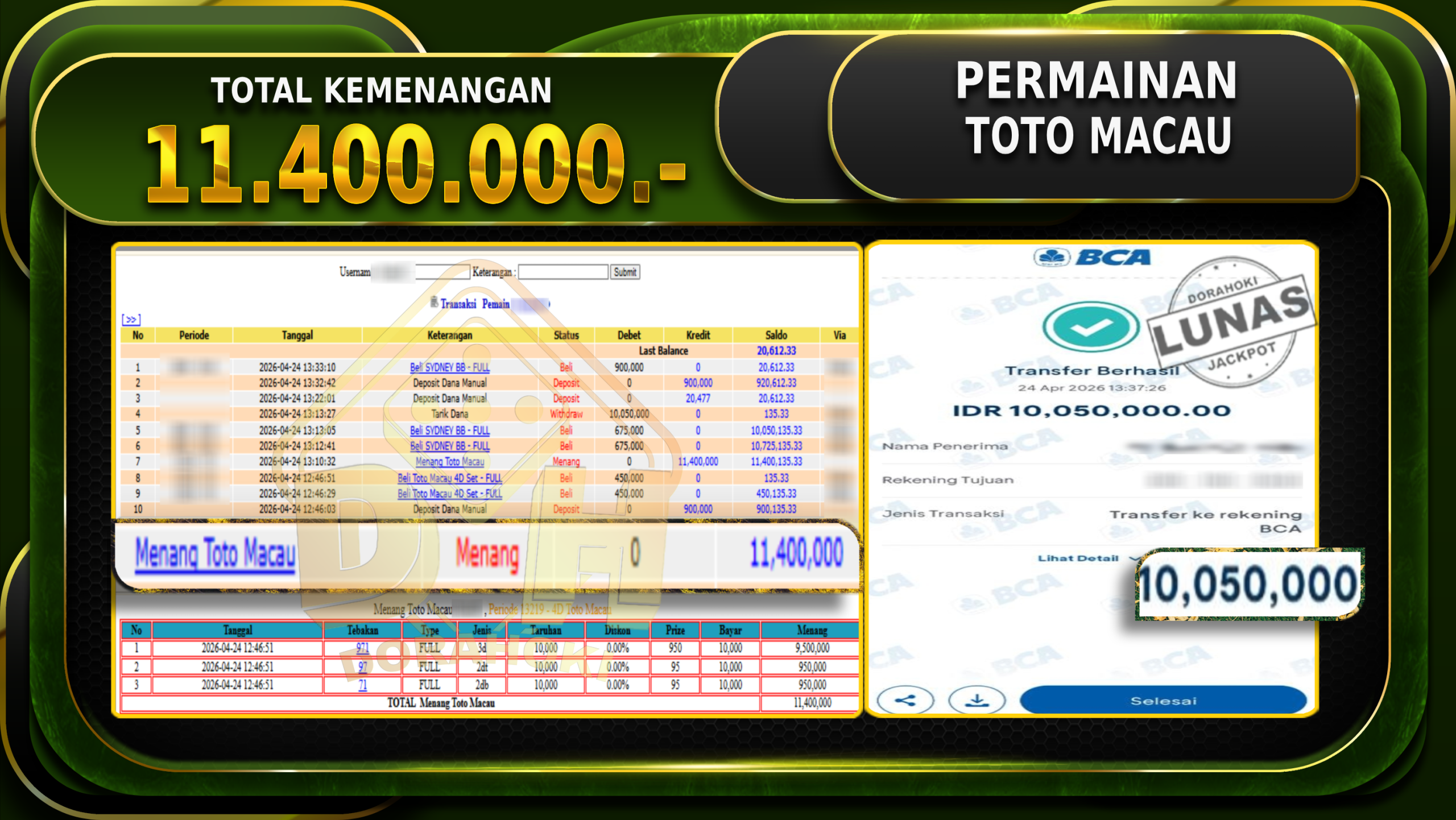 Bukti JP TOGEL KENTUCKYEVE – Selamat Kepada User ID : Proxxxxx atas kemenangan di TOGEL KENTUCKYEVE dengan total kemenangan Rp.23.200.000,- . Yang pasti nya langsung LUNAS Sesuai Bukti.