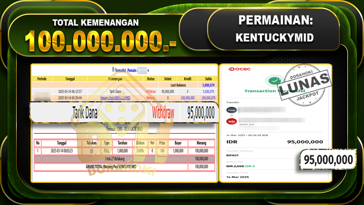 Bukti JP TOGEL KENTUCKYMID – ucapkan selamat kepada user id Herxxx atas kemenangan di TOGEL KENTUCKYMID dengan total kemenangan Rp.100.000.000,- . Yang pasti nya langsung LUNAS sesuai bukti ya bosku. Dorahoki nih bosku berapapun akan tetap kami bayar lunas ya bosku.