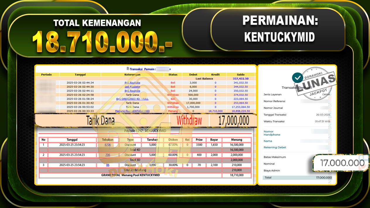 Bukti JP TOGEL KENTUCKYMID – ucapkan selamat kepada user id Hajxxx atas kemenangan di TOGEL KENTUCKYMID dengan total kemenangan Rp.18.710.000,- . Yang pasti nya langsung LUNAS sesuai bukti ya bosku. Dorahoki nih bosku berapapun akan tetap kami bayar lunas ya bosku.