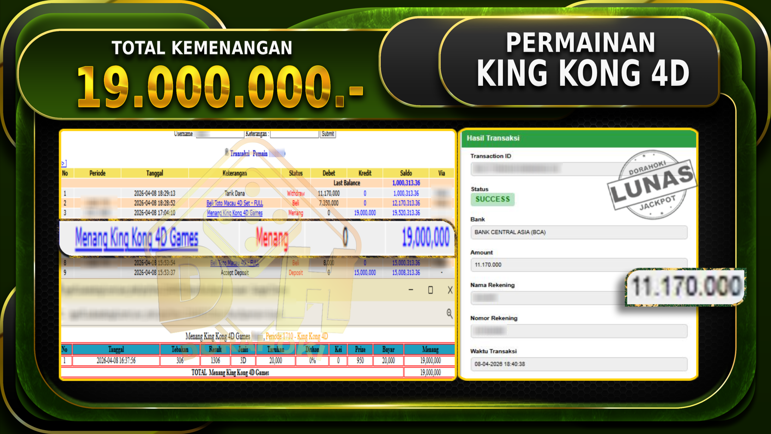 Bukti JP TOGEL KING KONG 4D – ucapkan selamat kepada user id Busxxx atas kemenangan di  TOGEL KING KONG 4D dengan total kemenangan Rp.19.000.000,- Yang pasti nya langsung LUNAS Sesuai Bukti.