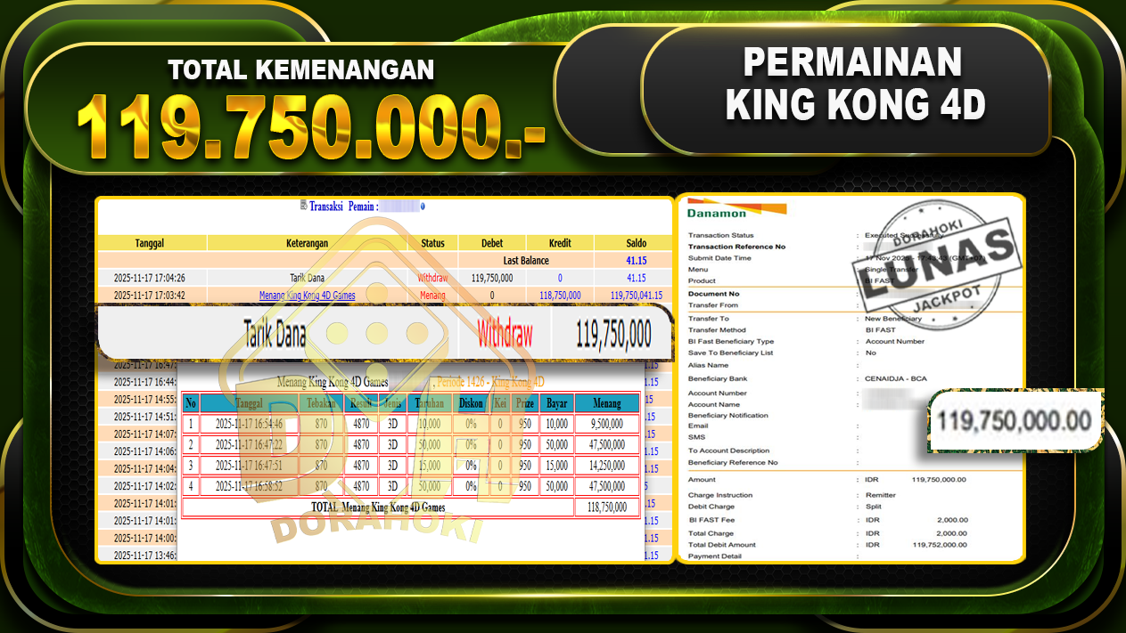 Bukti JP TOGEL KING KONG 4D – ucapkan selamat kepada user id invxxxxx atas kemenangan di TOGEL KING KONG 4D dengan total kemenangan Rp.119,750,000,- Yang pasti nya langsung LUNAS sesuai bukti ya bosku. Dorahoki nih bosku berapapun akan tetap kami bayar lunas ya bosku