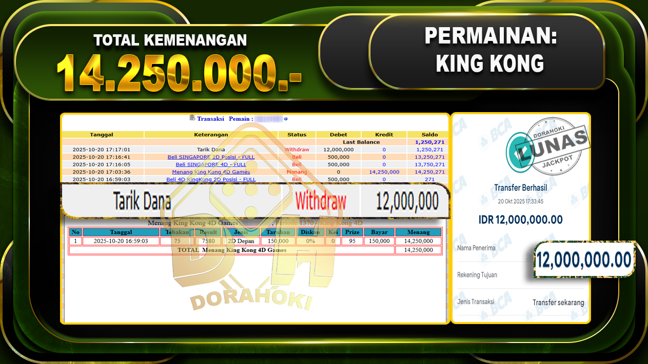 Bukti JP TOGEL KING KONG 4D – ucapkan selamat kepada user id alexxxx atas kemenangan di TOGEL KING KONG 4D dengan total kemenangan Rp.14,250,000,- Yang pasti nya langsung LUNAS sesuai bukti ya bosku. Dorahoki nih bosku berapapun akan tetap kami bayar lunas ya bosku