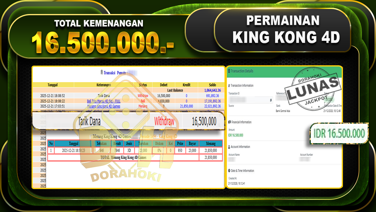 Bukti JP TOGEL KING KONG 4D – ucapkan selamat kepada user id busxx atas kemenangan di TOGEL KING KONG 4D dengan total kemenangan Rp.16.500.000,- Yang pasti nya langsung LUNAS sesuai bukti ya bosku. Dorahoki nih bosku berapapun akan tetap kami bayar lunas ya bosku