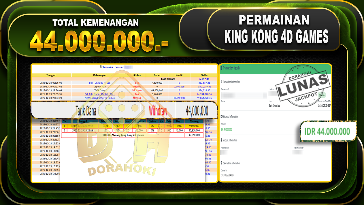 Bukti JP TOGEL King Kong 4D Games – ucapkan selamat kepada user id busxxx atas kemenangan di TOGEL King Kong 4D Games dengan total kemenangan Rp.44.000.000,- Yang pasti nya langsung LUNAS sesuai bukti ya bosku. Dorahoki nih bosku berapapun akan tetap kami bayar lunas ya bosku.