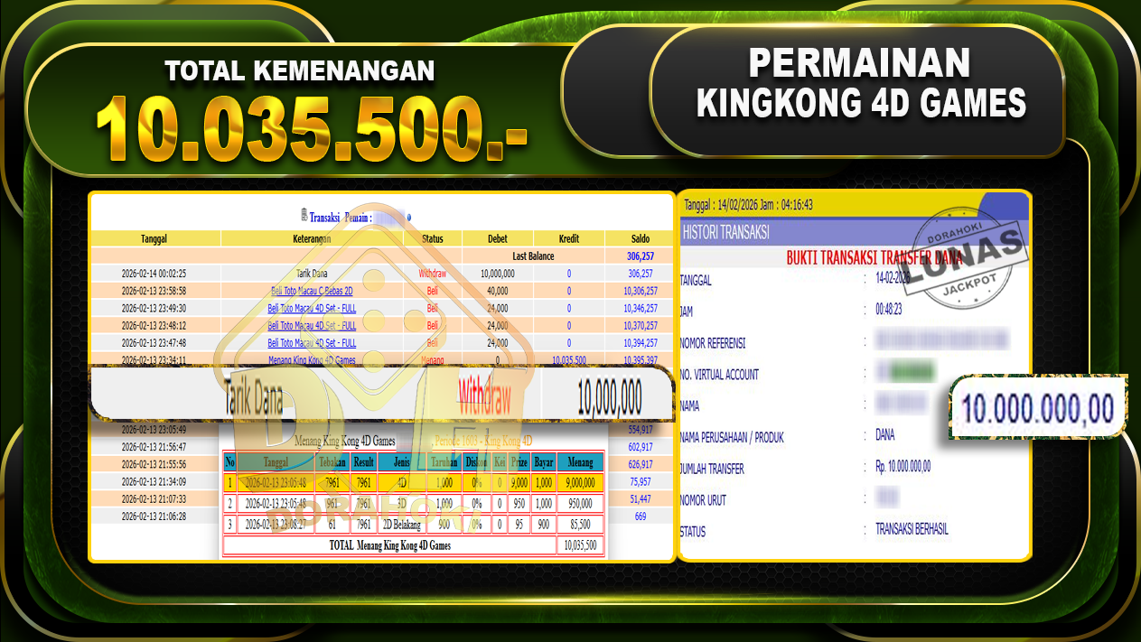 Bukti JP TOGEL KingKong 4D – ucapkan selamat kepada user ID Rusxxxx atas kemenangan di  TOGEL KingKong 4D dengan total kemenangan Rp.10.000.000,- Yang pasti nya langsung LUNAS sesuai bukti ya bosku.  Kemenangan Berapapun Situs DoraHoki Akan Membayar Lunas yah kami bayar lunas ya bosku